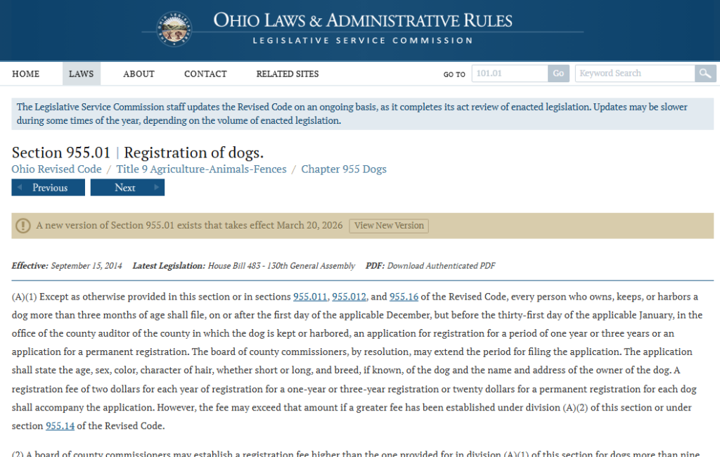 All dogs over the age of three months in Ohio are required to be licensed by state law. ORC 955.01 requires every dog owner to register their pet with the county, ensuring compliance with local regulations https://codes.ohio.gov/ohio-revised-code/section-955.01 and supporting public safety. The Ohio dog license law, codified in ORC 955.01, establishes the legal framework for county licensing of dogs. The law mandates that owners file a registration application within 30 days of acquiring a dog or during the annual licensing window from December 1 to January 31. This regulation applies to all dogs kept, harbored, or owned within Miami County and across the state.