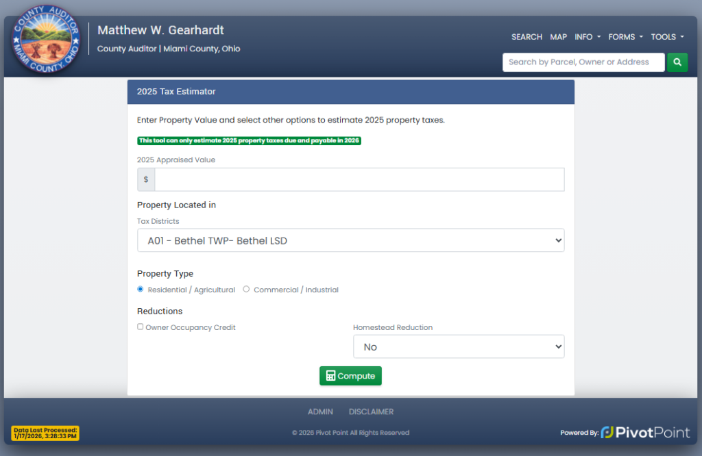 This official Miami County property tax calculator is provided directly by the Miami County Auditor’s website and estimates property taxes due and payable in 2026 based on your input. You can use it by entering your appraised value, selecting your tax district, choosing a property type, and adding any applicable credits or exemptions. The government’s official tool page is available here: https://www.miamicountyohioauditor.gov/TaxEstimator